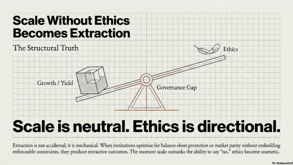 Scale is neutral. Ethics is directional. When institutions optimise for growth, yield, balance-sheet protection, or market parity without embedding enforceable ethical constraints, they will always produce extractive outcomes. Extraction is not accidental. It is mechanical.
