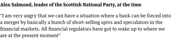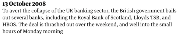Sep 2008, UK’s largest lender, HBOS, rescued by Lloyds TSB after a huge drop in share price.