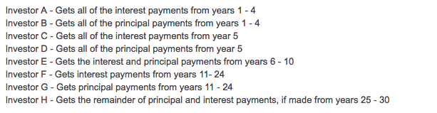 Here, Investor A has the safest investment, and investor H has the riskiest. Another way to slice risk is that the equity investors take the brunt of the first defaults. The Senior investors would only be affected if more than 8% of borrowers defaulted.