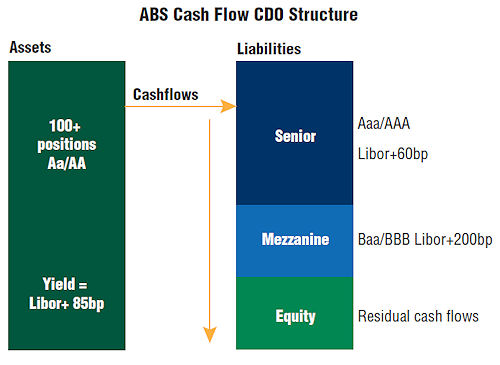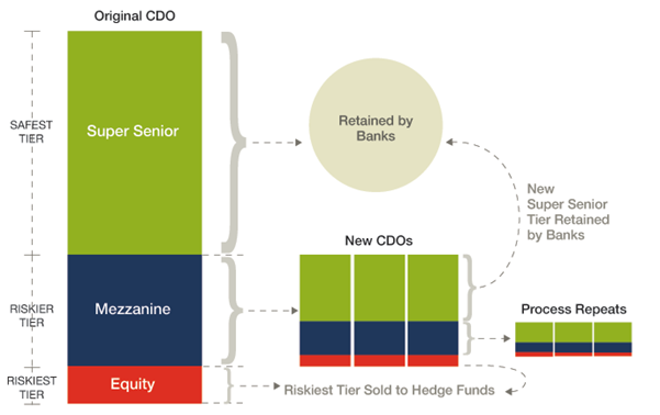 MBS is explained above – CDO (Collateralised Debt Obligations) are similar  – but they have one additional feature – the risk of the underlying mortgages was sliced into different levels of risk – from the “safest” (Senior tranche) to the middle risk (Mezzanine) to the more risky tranches (Equity, or Junk). For example:
