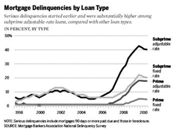 Look at the types of mortgages that resulted in default: we can see that subprime adjustable rate were the massive driver: